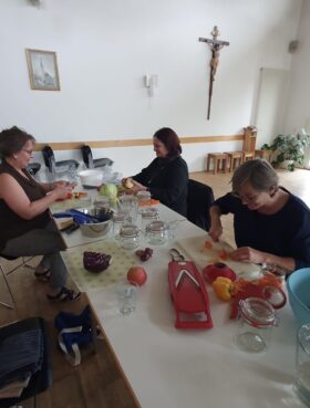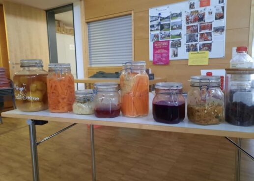 Die Christliche Frauengemeinschaft Eggstätt informiert: “Fermentieren liegt momentan voll im Trend. Vielleicht weil Nachhaltigkeit für viele immer wichtiger wird, oder weil wir mehr Zeit zu Hause verbringen und Neues ausprobieren wollen. Dennoch ist die Fermentation von Lebensmitteln keine neue Erscheinung. Vor allem zu Konservierungszwecken fermentieren die Menschen schon seit Jahrtausenden.Bei der Fermentation oder Fermentierung handelt es sich um einen natürlichen Gärungsprozess, der beispielsweise durch Milchsäurebakterien ausgelöst werden kann. Und so hatten auch wir letzten Freitag unseren ersten Fermentationskurs um am Ball zu bleiben. Unter Leitung von Sigrun Schuster haben wir dazu viel Wissenswertes erfahren und durften dann im Anschluss auch allerlei Gemüse schnipseln und in Weckgläser füllen. Ein jeder konnte nach getaner Arbeit ein Glas mit Gemüsesticks und ein Glas „Kimchi alla Sigrun“ fermentiert mit Nachhause nehmen und hatten Ihre Freude daran. Also wer mal im Kühlschrank noch Gemüse hat dass schnell weg muss und nicht alles auf einmal essen kann, dann macht einfach mal schnell Sticks oder ein Kimchi in ein Weckglas ein. Danke Sigrun, war ein sehr informativer Nachmittag”.
