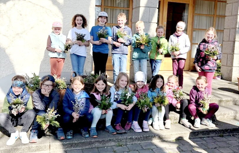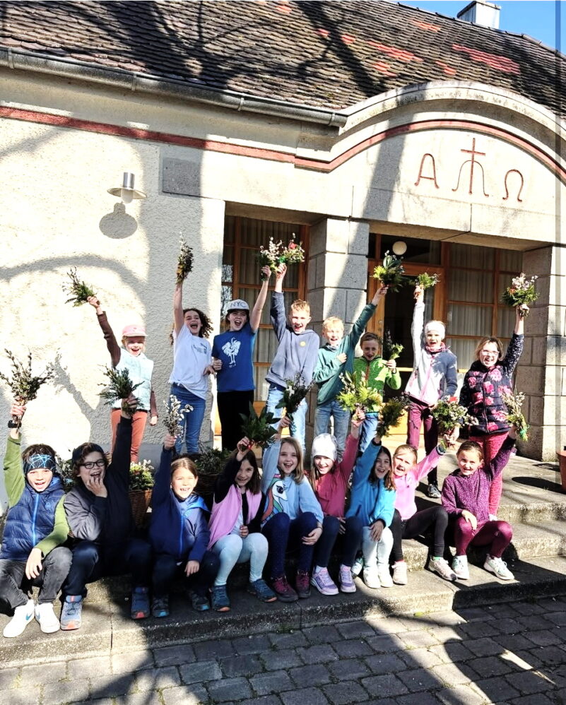 Rückblick in Eggstätt: Palmbüschelbinden mit den Kommunionkindern – Bei traumhaftem Wetter waren die Kommunionkinder und alle Helferinnen mit Feuereifer bei der Sache.