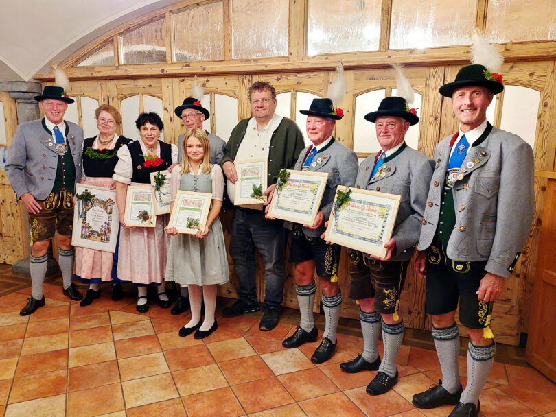 Hans Vogl kann ebenfalls auf eine 60-jährige Mitgliedschaft zurückblicken. Als Kassenwart wachte er 21 Jahre über die Vereinsfinanzen und chauffierte in der Zeit von 1962 bis 1975 den legendären Gauvorplattler Schorsch Argstatter, sen. zu den Proben, da dieser keinen Führerschein besaß. Unzählige Auszeichnungen und Ehrungen – wie die Ehrenmitgliedschaft, das goldene Vereins- und silberne Gauehrenzeichen – begleiteten sein trachtlerisches Leben. Vor 25 Jahren verlegten die „Innviertler“ ihr Vereinslokal in das Gasthaus „Happinger Hof“. Da ist es eine Selbstverständlichkeit, dass „Herbergsvater“ Martin Kupferschmied Mitglied bei den „Innviertlern“ geworden ist. Auch er erhielt eine Ehrenurkunde. Stolze 10 Jahre sind Lina und Christine Argstatter im Verein. Lina startete ihre Kariere in der Kindergruppe, Christine als Dindlvertreterin und Brauchtumswartin. Ganz besonders liegen ihr die „Innviertler Senioren Treffen“ am Herzen. Mit Schuhplattlern, Volks- und Trachtentänzen der Jugend- und aktiven Plattlergruppe endet der Ehrenabend der „Innviertler“.