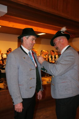 Willkommene Gäste waren Gauvorstand Pankratz Perfler, Ehrenvorstand Hans Schmid mit Frau, Ehrenbürger Hans-Jürgen Tremmel, ehemaliger Bürgermeister Sepp Trost sowie Schirmherr für das nächstjährige Gaufest, Bürgermeister Christoph Schneider. Fast auf den Tag genau vor 120 Jahren am 22.11.1903- gründeten 15 Kameraden, welche sich aus dem Trachtenverein Edelweiß Neubeuern abspalteten, den Trachtenverein Immergrün Altenbeuern, heute einer der mitgliederstärksten Vereine im Gauverband. Anektoden und Wissenswertes aus dieser Zeit berichtete Konrad Stuffer, Festleiter des anstehenden Gaufestes – wie bereits 2013, als man das Fest schon einmal ausrichtete. Der Verein ist nun zum fünftenmal Ausrichter eines Gaufestes. Ihr habt uns damit vor einer großen Sorge bewahrt, gestand der Gauvorstand. Kein weiterer Verein fand sich bereit, dies Aufgabe zu übernehmen. Peter Bichler, auch damals vor 10 Jahren schon Vereinsvorstand, informierte über den einstimmigen Beschluß der Mitgliederversammlung. Zusammenhalt, Verantwortwortungsgefühl, Eintreten für das Brauchtum und Bekenntnis zur Tracht als Kleidung oder zu den Werten des Trachtenwesens waren Grundlage zahlreicher Ehrungen. Das Silberne Gauehrenzeichen wurde vom Gauvorstand verliehen an Sepp Lenz, Richard Stradler, Rupert Paul, Gerhard Hefter, Georg Gar und Peter Bichler. Langjährige Mitgliedschaft zeichnet sie aus. Funktionen als Beisitzer, Musiker (Lenz Sepp), Schriftführer (Richard Stadler), Fuhrwerker mit den Festwägen,(Rupert Paul) waren u.a. arbeitsreiche Aufgaben, welche ausgeführt wurden. Gerhard Hefter, aktueller Schriftführer seit 16 Jahren, oftmaliger Theaterspieler, Georg Gar, stellvertretender Vorstand und Vorplattler und Peter Bichler, jetzt Vorstand seit 2011 und vorher Stellvertreter wurden ebenfalls mit dem Silbernen Ehrenzeichen bedacht. Das Ehrenzeichen in Gold wurde von Pankratz Perfler an Andreas Leitner und Thomas Bichle Bruder des Vorstand verliehen. Eine lange Reihe von verantwortlichen Aufgaben wurden von ihnen bewältigt. Leitner ist seit 20 Jahren Kassier des Vereins, Bichler war 21 Jahre verantwortlich für die Fahne des Vereins bei allen Anlässen.