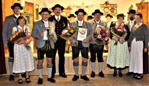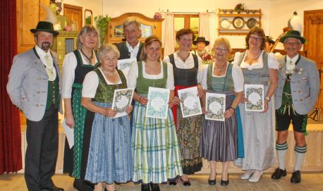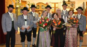 Anschließend wurden von Vorstand Gust Grundner, stv. Vorstand Georg Hanslmeier sowie der Kassierin Elisabeth Reindl und Schriftführerin Margit Holzner 46 Mitglieder mit einer Urkunde geehrt, die drei, vier und fünf Jahrzehnte dem Verein als passive Mitglieder die Treue gehalten haben. Mit Urkunde und Anstecknadel wurden zum Dank für ihre Aktivität Matthäus Huber (30 Jahre), Martin Schwarzenbeck, Richard Schwarzenbeck, Sabine Schwarzenbeck, Gerlinde Späth und Hermann Zenz (jeweils 40 Jahre) bedacht. Fünfzig Jahre aktive Vereinsmitglieder sind Maria Halbedl (Gewaig), Therese Kirchthaler und Monika Lechner und bekamen dafür ebenfalls Urkunde und Anstecknadel sowie, wie auch die folgenden Geehrten, einen Blumenstrauß und das Buch „Trachtenlandschaft Bayern“ bzw. eine Gauchronik.