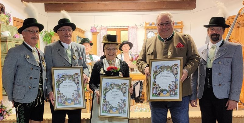 Für besondere Verdienste um die Trachtensache in ihrer 50-jährigen aktiven Vereinszugehörigkeit erhielten Leonhard Holzgaßner, Simon Maier, Maria Neumaier und Augustin Grundner das Goldene Gauehrenzeichen aus der Hand des Gebietsvertreters. Leonhard Holzgaßner wirkte in jungen Jahren in der Tanz- und Plattlergruppe mit. Er ist ein eifriger Festbesucher, wobei ihm besonders die Trachtenwallfahrt nach Maria Eck und das Gaufest wichtig sind. Beim Gaufest stellte er sich schon des Öfteren als Zugführer und Kommunionausteiler zur Verfügung. Besonders engagiert ist er beim Theater. Seit seiner ersten Rolle im Jahr 1971 stand der „Schneider Hardl“ bis jetzt mit Rollen in 79 Theaterstücken auf der Bühne, davon überwiegend als Hauptdarsteller und zweimal im Jahr. Simon Maier war ebenfalls in jungen Jahren Plattler und Tänzer und spielte auch einige Male Theater. Er war ein maßgeblicher „Treiber“ bei der Gründung der Schnalzergruppe, deren Mitglied er lange Jahre war. Als Rosserer setzte er sich auch intensiv für die Wiedereinführung der Leonhardifahrt Thambach im Jahr 1976 ein. Der „Draxler Simmerl“ ist bis heute auf fast jeder Veranstaltung des Vereins in sauberer Tracht anwesend. Maria Neumaier war von 1974 bis 2010 Ausschussmitglied als Elternvertreterin und als Beisitzerin. Sie ist eine eifrige Festbesucherin und zieht ihr Röcki gerne bei Vereins- und kirchlichen Anlässen an. Sehr begehrt sind bei Veranstaltungen ihre Küachl und Krapfen, die sie mit viel Liebe bäckt. Augustin Grundner war von 1974 bis 1986 Jugendleiter, von 1986 bis 1992 Vorplattler, von 1992 bis 1995 Beisitzer und beim 75-jährigen Gründungsfest im Jahr 1995 Festleiter. Seit 1995 ist er 1. Vorstand des Vereins. Er erhielt, ergänzt mit Worten des stellvertretenden Vorstands Josef Bibinger, aus der Hand des Gebietsvertreters zusätzlich den Ehrenkrug des Gauverbandes I für 25-jährige Vorstandstätigkeit, der auch schon beim Gründungsfest im Jahr 2020 überreicht werden sollte.