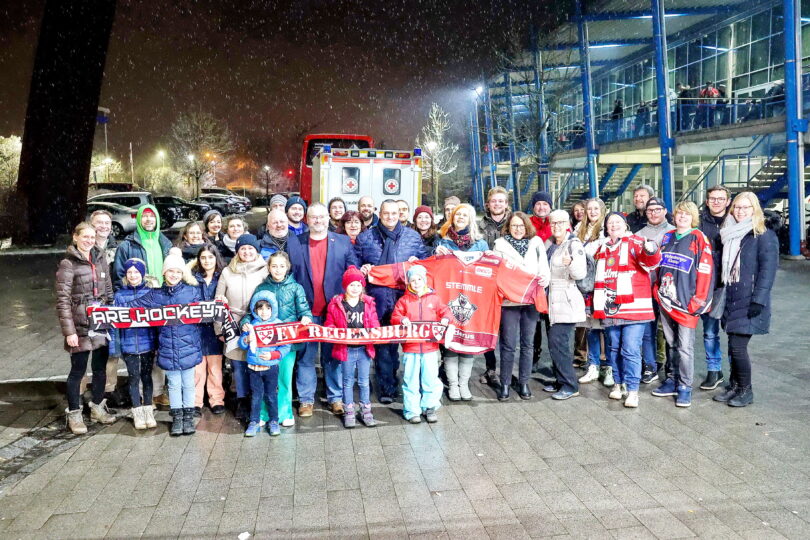Am vergangenen Sonntag wurde das Heimspiel der Regensburger Eisbären gegen die Eispiraten aus Crimmitschau von einer ganz besonderen Fangemeinde angefeuert: Engagierte mit der Bayerischen Ehrenamtskarte und deren Familien aus Regensburg. Rund 600 Personen konnten sich über Freikarten freuen. EVR Eisbären Geschäftsführer Christian Sommerer, der die Aktion initiiert hat, war es wichtig ein Zeichen der Wertschätzung zu setzen: „Ohne Ehrenamtliche wären die Eisbären wie auch die Stadtgesellschaft eine andere. Für ihren unermesslich wichtigen Beitrag möchten wir uns ganz herzlich bedanken.“ Auch das Rahmenprogramm lenkte an diesem Tag die ganze Aufmerksamkeit auf die freiwillige Arbeit der Regensburgerinnen und Regensburger. Den Puckeinwurf übernahm in Vertretung aller Ehrenamtlichen im Stadion Joachim Bauer, der sich bereits seit über 20 Jahren beim THW als Ortsbeauftragter engagiert. „Vor den vielen Menschen, die sich für andere einsetzen, habe ich großen Respekt“, honoriert Oberbürgermeisterin Maltz-Schwarzfischer in ihrer Begrüßung. Jedes Engagement sei vor allem ein Geschenk an Zeit, und Zeit sei vielleicht das Kostbarste, das Menschen zu verschenken haben, so Gertrud Maltz-Schwarzfischer weiter und bedankte sich für die Zeit, die Ehrenamtliche für ihr Engagement aufbringen. Anschließend überreichte sie das Präsent des vorangegangenen Gewinnspiels an die glückliche Gewinnerin Elke Hopp: ein unterschriebenes Trikot der Eisbären.