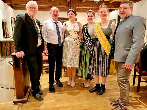 Bericht und Bilder: Sepp Lausch / Freie Wähler – Bild 1. v.l. Gerhard Schloots, Landtagskandidat Rosenheim Ost, Hubert Aiwanger, einige Königinnen, darunter die Bayerische Honigkönigin, Sepp Lausch, Landtagskandidat Rosenheim West