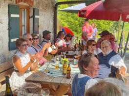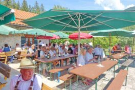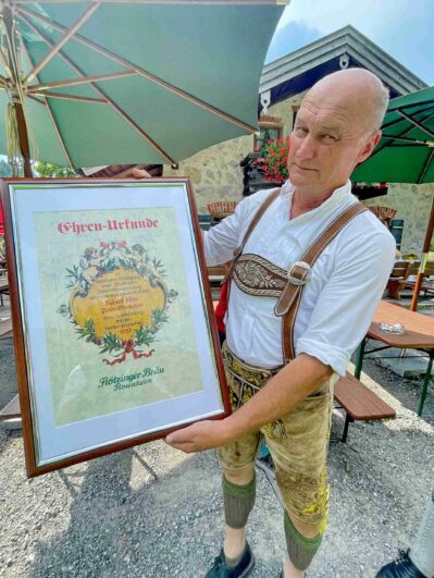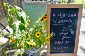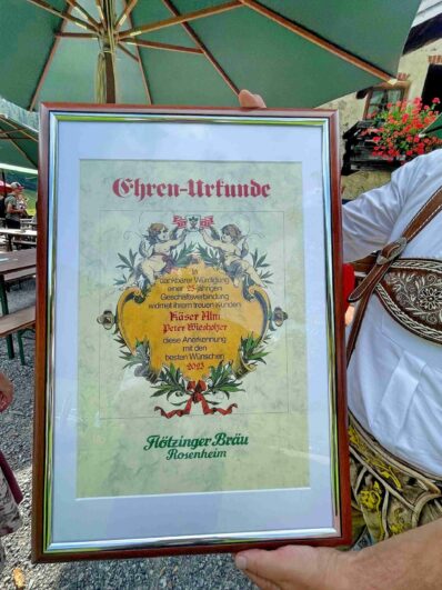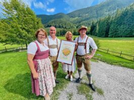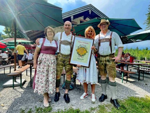 Für die Wirtsleute Peter und Marlies Wiesholzer war die Zusammenkunft ein willkommener Anlass zum Danke-Sagen. „Ohne Euch, liebe Mitarbeiterinnen und Mitarbeiter und ohne Euch liebe Besucher wären wir nicht so weit gekommen, lasst uns auch weiter gemeinsam Freude haben an unserer Form des Almlebens“ – so die Gastgeber, die noch darauf hinwiesen, dass ihre aktuellen Öffnungszeiten von Donnerstag bis Sonntag tagsüber sind und dass für die Freitage nach dem Rosenheimer Herbstfest wieder der „Musikalische Herbst auf dem Samerberg“ geplant ist. Ein besonderer Dank an die Wirtsfamilie kam von der Rosenheimer Privatbrauerei Flötzinger. Für nunmehr 25jährige Kunden-Treue übergaben Geschäftsführerin Marisa Steegmüller und Gebietsverkaufsleiter Matthäus Wallner eine große Urkunde.