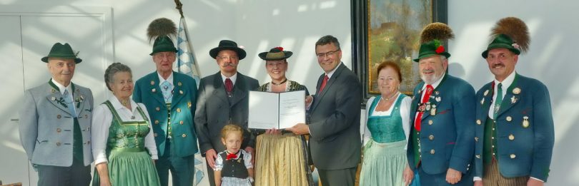 Vielfältige, außergewöhnliche und überdurchschnittliche Verdienste im Ehrenamt würdigt die bayerische Staatsregierung mit dem Ehrenzeichen des Bayerischen Ministerpräsidenten. Jüngste Empfängerin dieser besonderen Auszeichnung in der Bayerischen Staatskanzlei war Hildegard Hoffmann vom Bayerischen Trachtenverband. Seit der im Jahr 2005 stattgefundenen Jahresversammlung im niederbayerischen Deggendorf setzt sich Hildegard Hoffmann für den Dachverband und für die Trachtensache als Schriftführerin und als Organisationstalent ein. „Ihr zusätzliches Wirken seit 1993 beim Trachtenverein D´Loisachtaler Stamm München sowie als Volksmusikantin und Vortänzerin bei vielen Veranstaltungsformen machen Sie zu einer wahren Persönlichkeit. Ihre gänzliche Freizeit widmen Sie dem Ehrenamt, was der Staat und die Gesellschaft hoch schätzen, Sie leisten damit einen wertvollen Beitrag bei der Weitergabe des Wissens an die nächsten Generationen“, so Staatskanzlei-Minister Florian Herrmann bei der Überreichung des Ehrenzeichens mit Urkunde. Mit dabei waren bei der Feierstunde auch Landes-Ehrenvorsitzender Otto Dufter mit Ehefrau Hilde, Landesvorsitzender Max Bertl mit Ehefrau Annemarie sowie Ehrenmitglied und Herausgeber des Heimat- und Trachtenboten Konrad Vogel. „Auch wenn es nicht immer einfach und leicht ist, die vielen ehrenamtlichen Aufgaben mit Familie und Beruf unter einen Hut zu bringen, so überwiegen doch Freude, Freundschaft und Vertrauen“, so Hildegard Hoffmann, die bereits mit der Bezirksmedaille des Bezirks Oberbayern ausgezeichnet worden war und die die neuerliche Ehrung im Beisein von ihrem Mann Christian Hoffmann und ihrer Enkelin Maxima entgegennahm. Nach ihren Dankesworten ergänzte Minister Herrmann die Ausführungen zum Ehrenamt mit folgender frohen Botschaft: „Laut einer Studie der Universität Michigan leben Ehrenamtliche länger, denn sie tun Gutes und dies wirkt sich auf das Wohlbefinden aus, ganz nach dem Motto: Ärzte sollten mehr Ehrenamt als Aspirin verschreiben“.