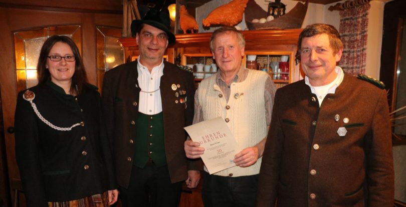 „Er hat sich um den Sachranger Schützenverein verdient gemacht“. Gauschützenmeister Bernhard Brehmer überreichte zusammen mit Schützenmeister Martin Bichl bei der Generalversammlung des Sachranger Schützenvereins im Sachranger Hof das Ehrenzeichen für 50 Jahre aktive Mitgliedschaft im Bayerischen Sportschützenbund (BSSB) und im Deutschen Schützenbund (DSB) an Franz Kinne. Werner Woog erhielt die Ehrenzeichen für 25 Jahre, er konnte an der Ehrung nicht teilnehmen. Brehmer merkte an, 50 und 25 Jahre seien im Rückblick eine lange Zeit, in der die beiden ihrem Schützenverein aktiv die Treue gehalten haben. Das beeindrucke ihn sehr; so bedanke er sich persönlich und auch namens des Schützengaus für dieses Engagement.