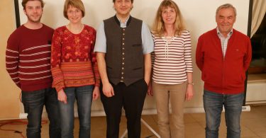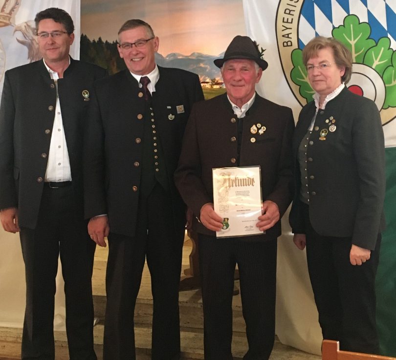 Bericht und Foto: Heinrich Rehberg – Josef Heinrich (zweiter von rechts) von der Schützengesellschaft „Chiemgauadler“ Umrathshausen erhielt aus der Hand des Bezirksschützenmeisters Alfred Reiner (zweiter von links) eine selten verliehene Auszeichnung: Das kleine silberne Edelweiß des Bezirks Oberbayern im BSSB – (von links), erster Bezirksjugendleiter Klaus Waldherr, erster Bezirksschützenmeister Alfred Reiner, Josef Heinrich und Elisabeth Maier, stellvertretende Bezirksschützenmeisterin.