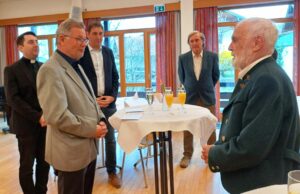 Pfarrer Konrad Roider Bürgermeister Herbert Strauch, Gemeinderat Hans Thullner sowie Landrat Sepp Konhäuser und Ludwig Klarwein bei der Überreichung des Ehrenzeichens im Pfarrsaal St. Nikolaus