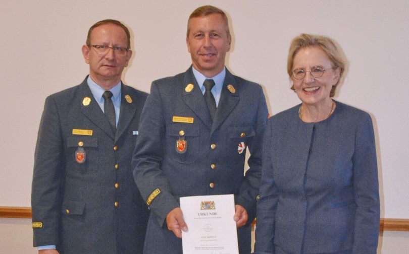 Foto: Regierung von Oberbayern – v.l.n.r. Hans Meyrl, Stadtbrandrat; Mario Zimmermann, Stadtbrandinspektor; Maria Els, Regierungspräsidentin