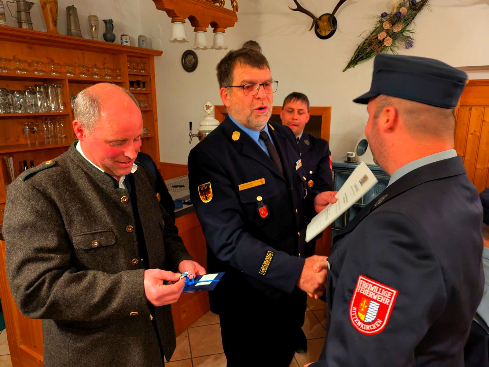 Christian Schuster bei der Ehrung durch Kreisbrandinspektor Franz Hochhäuser und dem stellvertretenden Bernauer Bürgermeister Franz Praßberger.