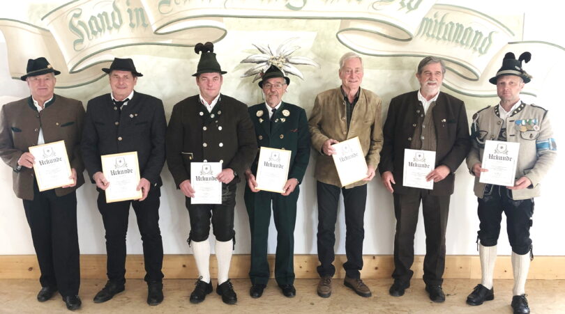 Josef Hobelsberger und Andreas Dörfl traten vor 60 Jahren als junge Reservisten in den Verein ein, Karl-Heinz Hüller ist seit 50 Jahren Mitglied der KSK Aschau, sie erhielten aus der Hand des Vorsitzenden die Ehrennadel und eine Urkunde des Vereins für 60 und 50-jährige Vereinstreue. Der Vorsitzende Hans Pellkofer, Georg Mix, Martin Bichl und Franz Peschka wurden für 40 Jahre geehrt, Gebirgsschützenhauptmann Hubert Stein, Walter Genzinger, Sigi Hamberger, Andreas Steinberger, Peter Anner und Franz Bachmann für ihre 25-jährige Vereinszugehörigkeit. Bürgermeister Simon Frank bedankte sich bei der KSK für die Beteiligung an den Veranstaltungen im Ort, diese trügen zu einem ausgesprochen guten Zusammenwirken der Ortsvereine bei. Weiter dankte er den Soldaten der dritten Kompanie Gebirgsjägerbataillon 231 (3./GebJgBtl 231) aus Bad Reichenhall – der Patenkompanie des KIZ Aschau – für ihre Anwesenheit als Ehrenposten am Denkmal in Niederaschau. Leider sei diese Verbindung der Gemeinde zur Reichenhaller Bundeswehr der Aschauer Zivilbevölkerung viel zu wenig bekannt und bewusst. Werner Stuhlrainer berichtete von der Sammlung für den Volksbund Deutsche Kriegsgräberfürsorge am Friedhof, die gemeinsam mit den Gebirgsschützen durchgeführt wurde. Die Sammlung ergab rund 1900 Euro, das bisher höchste Sammelergebnis..