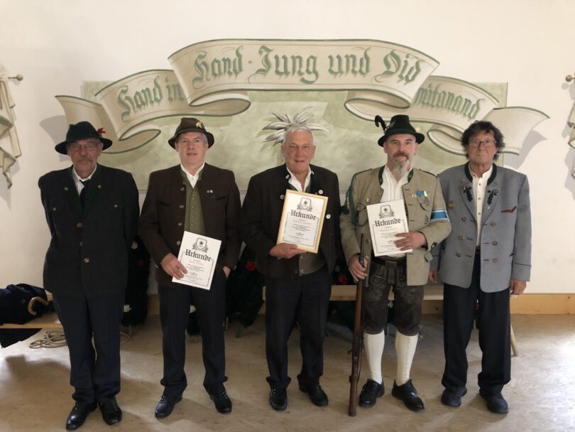 Helmut Gawlik trat 1973 als junger Reservist in den Verein ein und ist seit 50 Jahren Mitglied der KSK Aschau, er erhielt aus der Hand des Vorsitzenden die Ehrennadel und eine Urkunde des Vereins. Hans Hailer, Michael Hailer, Edi Maurer, Martin Klampfleitner senior und Hubert Wirth wurden für ihre 25-jährige Vereinstreue geehrt.Bürgermeister Simon Frank bedankte sich bei der KSK für die Beteiligung an den Veranstaltungen im Ort, diese trügen zu einem ausgesprochen guten Zusammenwirken der Ortsvereine bei. Weiter dankte er den Soldaten der dritten Kompanie Gebirgsjägerbataillon 231 (3./GebJgBtl 231) aus Bad Reichenhall – der Patenkompanie des KIZ Aschau – für ihre Anwesenheit als Ehrenposten am Denkmal in Niederaschau. Leider sei diese Verbindung der Gemeinde zur Reichenhaller Bundeswehr der Aschauer Zivilbevölkerung viel zu wenig bekannt und bewusst.