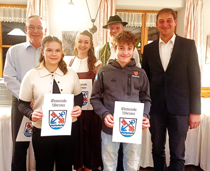 Bericht und Bild: Christiane Giesen – Bei der Weihnachtsfeier der Gemeinde Übersee ehrte Bürgermeister Herbert Strauch (rechts) mit Urkunde und einem Geschenk (hinten von links,) Thomas Laumer, Veronika Brandstetter, Lukas Hiendl, vorne Felia Wengbauer und Elias Schnurrer.