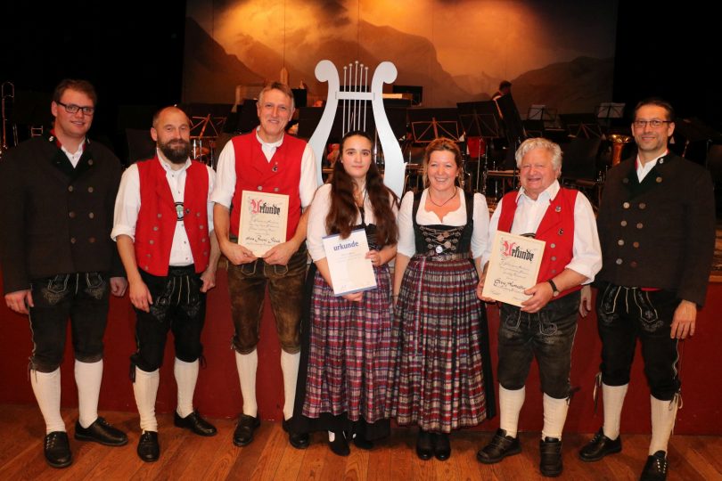 Die Ehrenurkunde des Musikbundes Ober- und Niederbayern für 40 Jahre aktives Musizieren verlieh Michael Morgott vom Bezirksmusikverband Inn-Chiemgau des Musikbundes von Ober- und Niederbayern an Andreas Pertl und Elisabeth Schelzke.