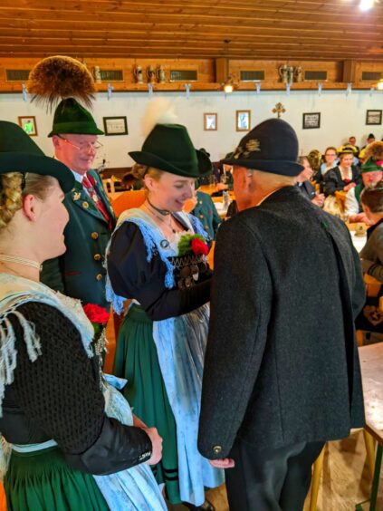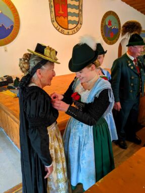 Alle geehrten Mitglieder erhielten von den beiden Dirndlvertreterinnen Katharina Pfaffinger und Katharina Wörndl jeweils ein Vereinsabzeichen als Dankeschön.