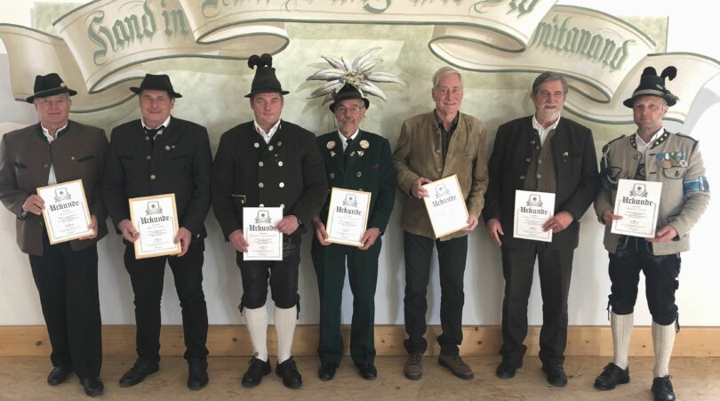 Josef Hobelsberger und Andreas Dörfl traten vor 60 Jahren als junge Reservisten in den Verein ein, Karl-Heinz Hüller ist seit 50 Jahren Mitglied der KSK Aschau, sie erhielten aus der Hand des Vorsitzenden die Ehrennadel und eine Urkunde des Vereins für 60 und 50-jährige Vereinstreue. Der Vorsitzende Hans Pellkofer, Georg Mix, Martin Bichl und Franz Peschka wurden für 40 Jahre geehrt, Gebirgsschützenhauptmann Hubert Stein, Walter Genzinger, Sigi Hamberger, Andreas Steinberger, Peter Anner und Franz Bachmann für ihre 25-jährige Vereinszugehörigkeit.