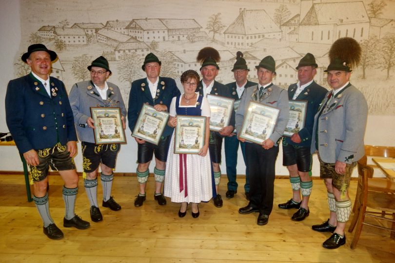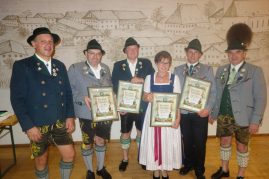 Trachtlerinnen und Trachtler aus dem Chiemgau, die sich in Jahrzehnten in bestimmten Aufgaben verdient gemacht haben, werden beim Chiemgau-Alpenverband mit dem Silbernen oder Goldenen Verdienstzeichen geehrt. Zuletzt erfolgte dies bei der Jahresversammlung des Gauverbandes in der voll besetzten Lamstoahalle von Frasdorf. Dabei erhielten aus den Händen der Gauvorstände Miche Huber aus Rottau und Georg Westner aus Amerang das Goldene Gauverdienstzeichen mit Urkunde Brigitte Furtner aus Frasdorf (langjährige Schriftführerin), Josef Mayer aus Frasdorf (25 Jahre Erster Kassier), Josef Enzinger aus Frasdorf (viele Jahre Jugendleiter und Vorplattler, seit 2010 Vorstand) und Hermann Lechner aus Übersee (25 Jahre Jugendleiter). Die Auszeichnung in Silber bekamen Alois Schröder und Sepp Pfisterer aus Übersee und Sepp Hamberger aus Sachrang für ebenfalls langjährige und unterschiedliche Ämterübernahme.