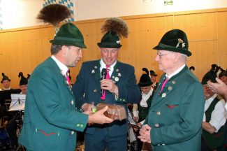 Im Rahmen des diesjährigen Trachtenjahrtags am Ostermontag konnte Balthasar Lackerschmidt (in Abwesenheit) für 50 Jahre aktive Mitgliedschaft ausgezeichnet werden. Als besonderes Dankeschön für sein jahrzehntelanges Busfahren überreichte Vorstand Franz Praßberger dem Vereinsmitglied Georg Winkler, der zum 1. Januar in den wohlverdienten Ruhestand gegangen ist, ein kleines Präsent in Form eines schön verzierten Schokoladen-Omnibus.