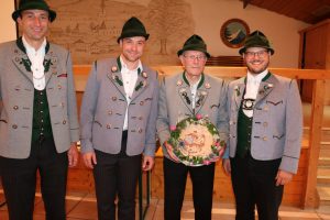 Der Vorsitzende des Trachtenvereins „D´ Lamstoana“ Frasdorf Sebastian Graf (rechts) und seine beiden Stellvertreter Georg Wörndl (links) und Andreas Kink (zweiter von links) überreichten den Ehrenteller für 75 Jahre aktive Vereinsmitarbeit an Sebastian Bauer