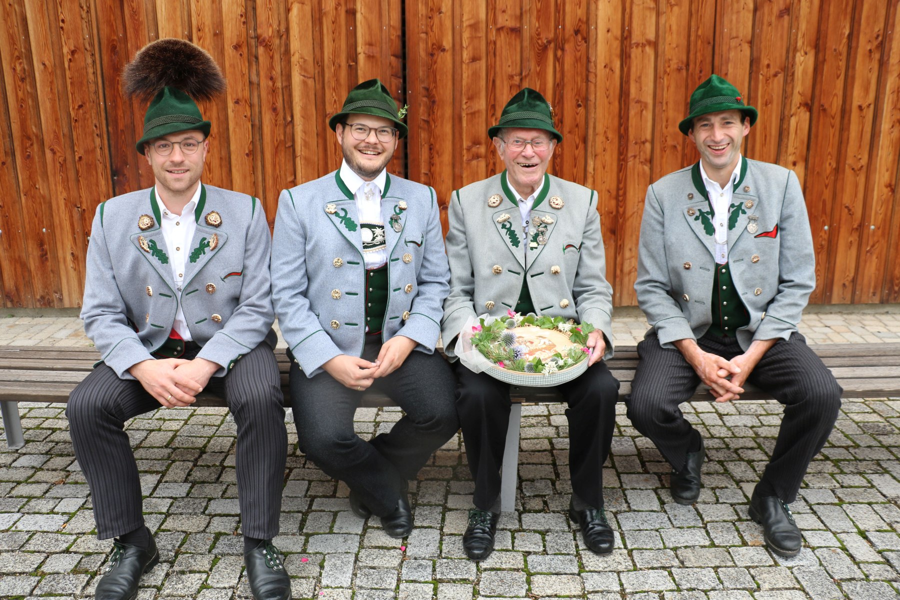 Der Vorsitzende des Trachtenvereins „D´ Lamstoana“ Frasdorf Sebastian Graf (zweiter von links) und seine beiden Stellvertreter Georg Wörndl (rechts) und Andreas Kink (links) überreichten den Ehrenteller für 75 Jahre aktive Vereinsmitarbeit an Sebastian Bauer