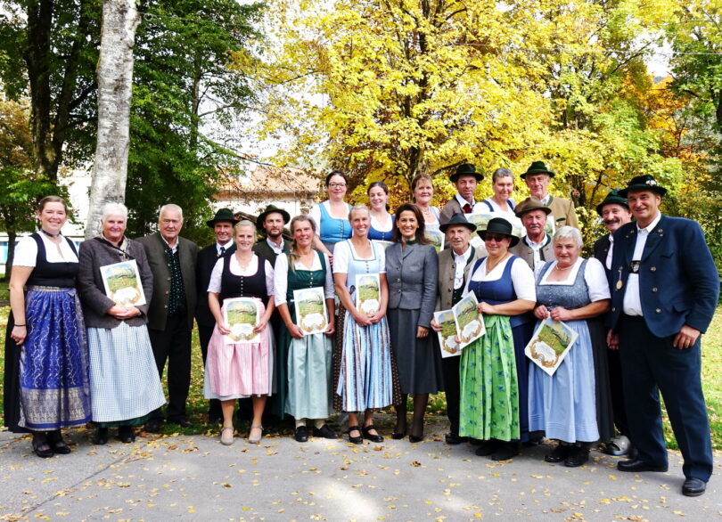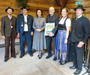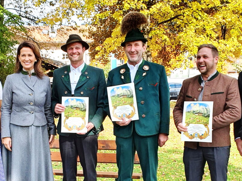 Die Almbewirtschafter freuen sich über die Anerkennung durch den Förderverein. Ministerin Michaela Kaniber (Mitte) und Vorstand Georg Mair (re. daneben) sind sich einig, dass die Auswahl gerechtfertigt ist.