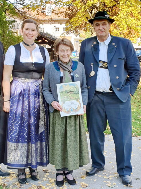 Auf 60 Almsommer kann Klara Berger zurückblicken. Eine Zahl über die Bürgermeister Justus Pfeifer (li.), AVO-Geschäftsführerin Brigitte Meier und Vorsitzender Josef Glatz nur staunen können.