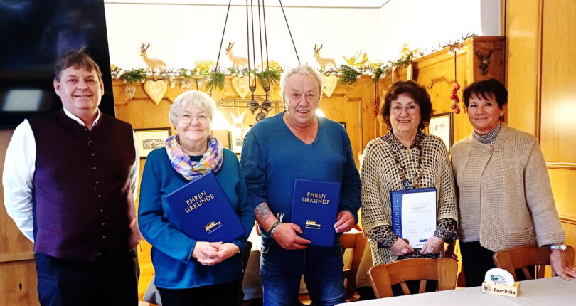 -Bei der Jahreshauptversammlung des VdK-Ortsverbandes Übersee ehrten der erste Vorsitzende Robert Leitner (links) und die zweite Vorsitzende Uschi Gnadl (rechts) mehrere Mitglieder für ihre langjährige Mitgliedschaft im Verein mit Urkunden und Geschenken geehrt, so Christa Falkinger und Rudi Gnadl für 30 Jahre und Elisabeth Seitz für 25 Jahre.