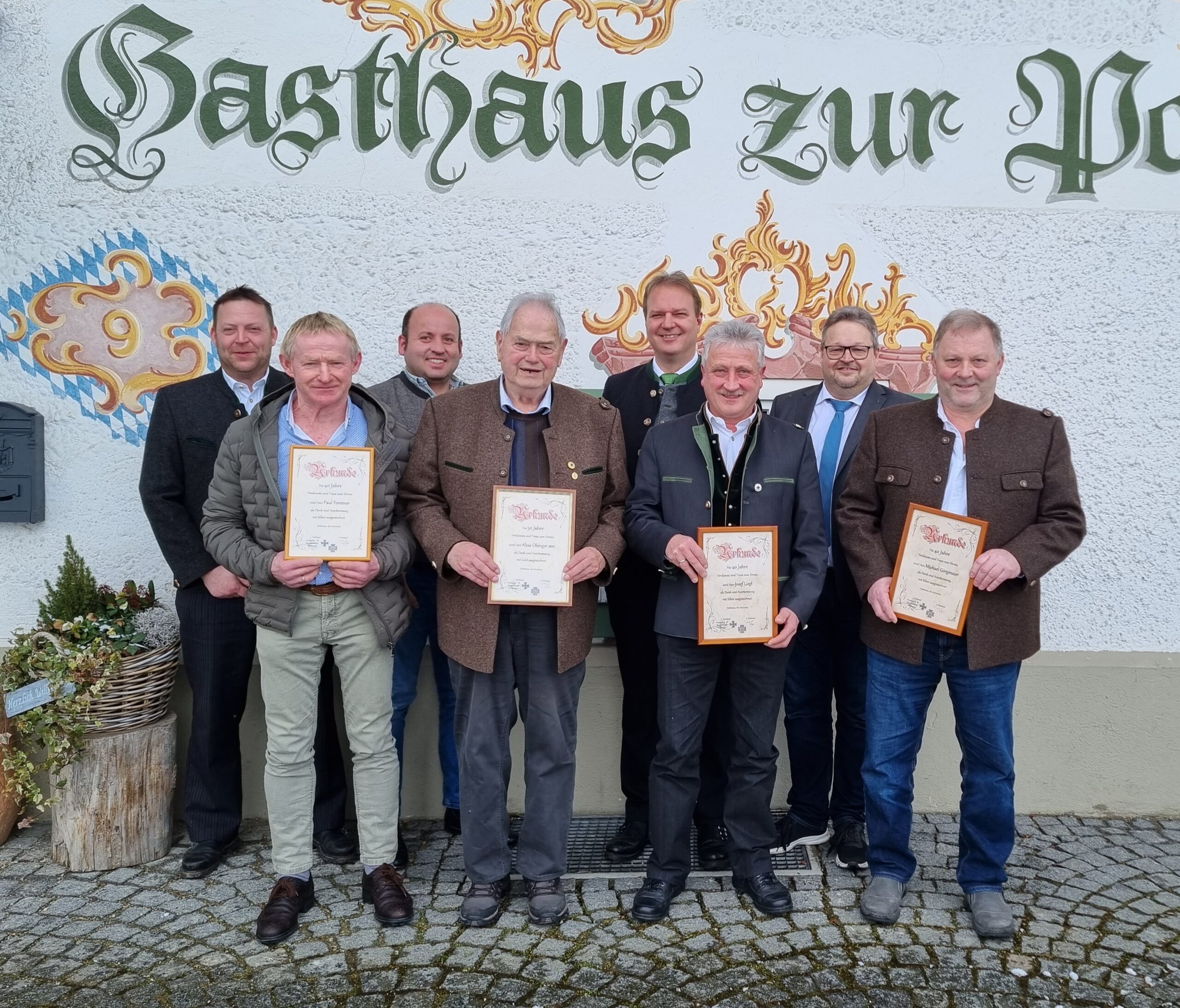 Paul Forstner, Alois Obinger, Josef Liegl, Michael Görgmaier vorne von links 2. Vorstand Michael Süss, Kassier Lorenz Liegl, 1. Vorstand Joachim Pfaller, Schriftführer Norbert Zehrer hinten von links