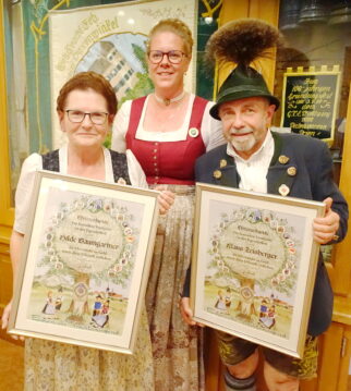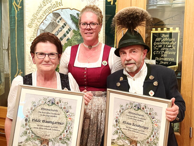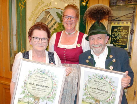Gleich zwei Leute aus den Reihen des Trachtenvereins „D´Hochplattner“ Grassau konnten bei der jüngsten Versammlung des Chiemgau-Alpenverbandes im Vereinshaus von Prien-Atzing mit der höchsten Auszeichnung der Bayerischen Trachtenjugend geehrt werden. Die Verleihung des Goldenen Ehrenzeichens der Bayerischen Trachtenjugend wurde von Jugendwartin Monika Hiendl an Hilde Baumgartner und Klaus Zeisberger vorgenommen.