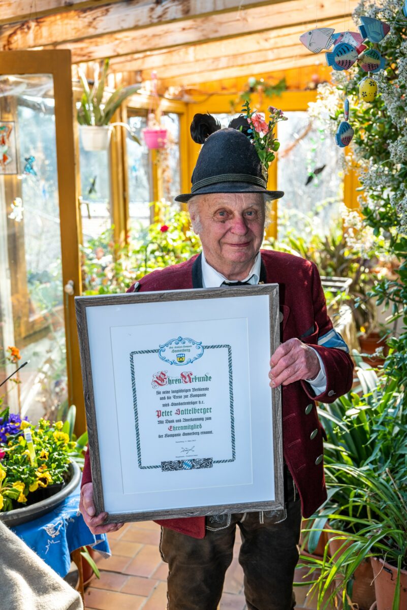 Die Gebirgsschützenkompanie Samerberg hat ein neues Ehrenmitglied: bei der 44. Jahresversammlung mit vorausgegangenem Gedenkgottesdienst in der Pfarrkirche „Mariä Himmelfahrt“ widerfuhr Oberjäger Peter Sattelberger für seine jahrzehntelangen Verdienste diese besondere Auszeichnung. Der „Obern-Peter“ ist Gründungsmitglied der Kompanie, er war viele Jahre als Oberjäger in der Vorstandschaft vertreten und trug von 2008 bis 2020 die Chiemgau-Standarte. Die Ehrung nahm Hauptmann Fritz Dräxl vor.