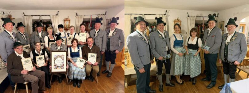 Neben den Verabschiedungen gab es an diesem Abend auch zahlreiche Ehrungen für Mitglieder, die dem Verein über viele Jahre hinweg die Treue gehalten haben. Erster Vorstand Claus Reiter nahm die Ehrungen vor, und Zweiter Vorstand Michael Stein überreichte die Ehrenanstecknadeln sowie Urkunden. Katharina Hendlmeier wurde für 25 Jahre Mitgliedschaft geehrt und ist derzeit als 2. Schriftführerin im Verein aktiv. Zuvor hatte sie bereits das Amt der 2. Kassiererin inne. Irmi Dangl und Josef Stangl wurden für 50 Jahre Vereinszugehörigkeit ausgezeichnet. Irmi Dangl war Dirndlvertreterin, während Josef Stangl viele Jahre lang verschiedene Ämter, darunter das des 1. Vorplattlers, Jugendleiters, Beisitzers und 1. Schriftführers, mit viel Hingabe ausübte. Für ihre 60-jährige Mitgliedschaft wurden Martin Blimetsrieder, Karin Edenhofer-Furlan, Dorothea Pertl, Franz Pfaffinger und Therese Stein geehrt. Walburga Frank, Monika Kaupert und Peter Schönleber wurden für 50 Jahre im Verein ausgezeichnet, während Ulrike Eibel, Heinz Scheck und Rosi Scheck für 25 Jahre im Trachtenverein mit Urkunden und Anstecknadeln geehrt wurden.