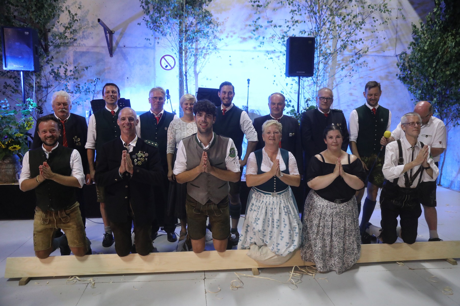 Harte Prüfungen auf ein scharfkantiges Holzscheitl: vorne von links nach rechts: Die kniehenden: Schirmherr und Bürgermeister Stefan Haberl, Wambachs 1. Schützenmeister Gerhard Grasser, 2. Schützenmeister Anton Kronseder, Festmutter Claudia Hartl, Festbraut Daniela Kordick, 1. Kassier Hans Kranich brachten ihre Bitten vor stehend hinten: Die Vorstandschaft des Schützenverein “Tannengrün Geislbach” besiegelten die Übernahme der Patenschaft