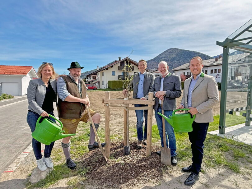 Inzwischen hat dieser Baum an zentraler Stelle am Eingang des Prientals seinen Platz gefunden – ein Ort, der wie geschaffen ist für dieses bedeutungsvolle Geschenk. Nach den sorgfältigen Vorbereitungen durch den gemeindlichen Bauhof wurde er in einem kleinen, feierlichen Rahmen gepflanzt. Schlechings Erster Bürgermeister Josef Loferer (Zweiter von links), Aschaus Erster Bürgermeister Simon Frank (Mitte) sowie der Zweite Bürgermeister Michael Andrelang (Vierter von links) griffen gemeinsam zum Spaten, um den Birnbaum symbolisch fest in der Erde zu verwurzeln. Die beiden Tourismusvertreter Elisabeth Keihl (links) vom Achtental Tourismus und Herbert Reiter (rechts), Tourismuschef von Aschau i.Chiemgau und dem Bergsteigerdorf Sachrang, gossen dazu den Birnbaum – ein Zeichen für Wachstum, Pflege und gelebte Partnerschaft.