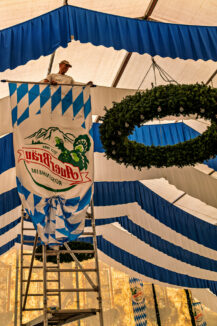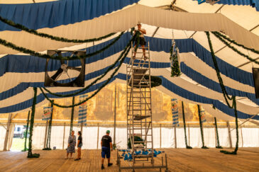 Die Dekoration des Zeltes ist heute eine gemeinschaftliche Meisterleistung. Bunte Bänder, traditionelle Fahnen und frische Blumen verleihen dem Raum eine festliche und einladende Atmosphäre. Die kreativen Ideen und das handwerkliche Geschick der Helfer sind überall sichtbar und tragen dazu bei, dass sich Gäste und Trachtler gleichermaßen wohlfühlen werden. Besonders kreativ ist die Jugend beim Aufbau des Barbereichs und der Kuchentheke.