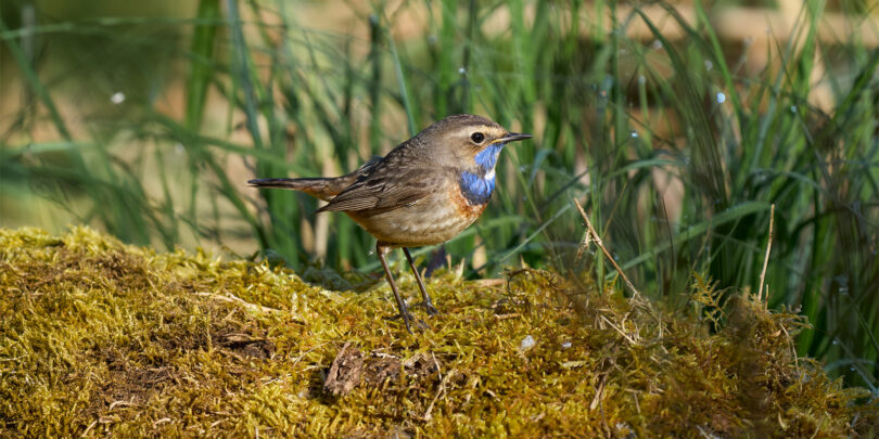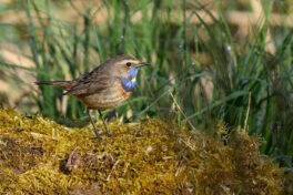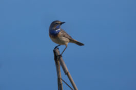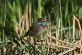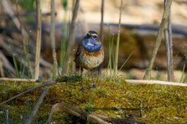 Der 27. April war ein echter Blaukehlchen-Glückstag am Beobachtungsturm der Hirschauer Bucht. Normalerweise brüten die Blaukehlchen eher im Grabenstätter Moos in den ausgedehnten Schilfflächen. Dort hört und sieht man sie zwar regelmäßig, aber es ist ziemlich schwierig auf eine fotografisch brauchbare Entfernung an sie heranzukommen. Bevor sie beginnen zu brüten machen sie allerdings oft eine Stippvisite zum Turm und dort konnte man mindestens drei Exemplare (zwei Männchen und ein Weibchen) aus teilweise kürzester Distanz (3m) beobachten. Sie ließen sich durch die begeisterten Fotografen auch überhaupt nicht stören und gaben ihr bestes uns jede Menge guter Fotos zu ermöglichen.
