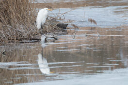 Weiter bin ich dann zur Prienmündung gefahren, die teilweise noch zugefroren ist. Dort wo kein Eis ist, schwimmen und tauchen verschiedene Enten. Die Stockente spazierte auf dem Eis, ohne auszurutschen und die Reiherente war Beobachter. Der Silberreiher und der Zwergtaucher haben eisfreie Plätzchen gefunden.