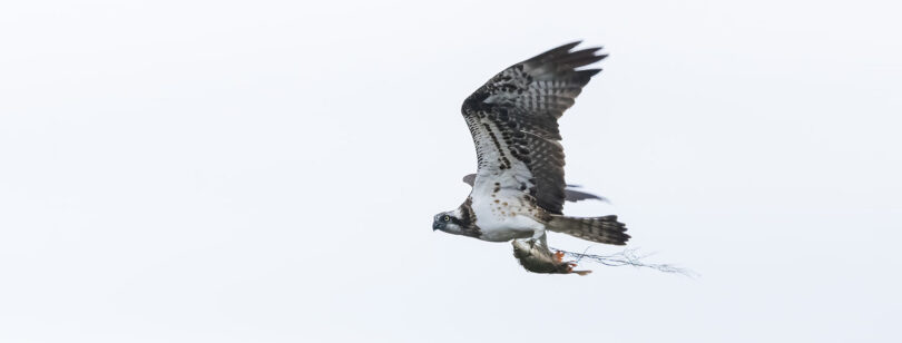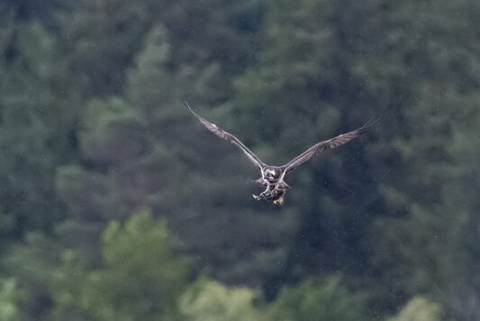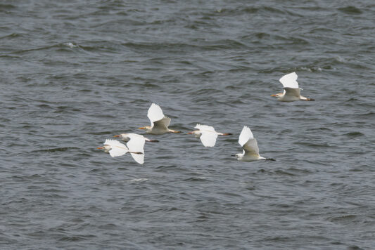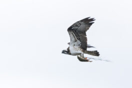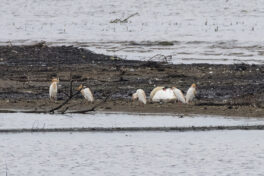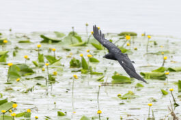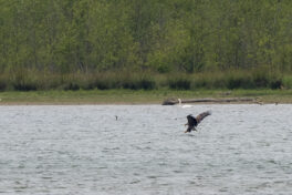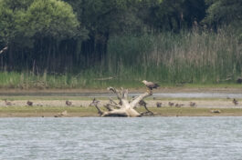 Vom Wetter unbeeindruckt zeigte sich die Fauna am Turm von ihrer besten Seite. Gleich am Morgen querte ein Fischadler, ganz offensichtlich auf Nahrungssuche, Richtung Hagenau die Bucht und erbeutete vor dem Hagenauer Turm eine Rotfeder. Mit seiner Beute in den Fängen flog er zurück und direkt am Turm vorbei. Die Bachstelze vom Turm ist schon wieder fleißig dabei ein neues Nest zu bauen und legt hin und wieder eine Rast auf den Eisvogelansitzen ein. Krähen patrollieren immer wieder durch das Teichrosenfeld auf der Suche nach fressbarem. Auch ein Graureiher versuchte sein Jagdglück im Teichrosenfeld, zog aber unverrichteter Dinge schnell wieder ab. Ein Rohrweihenmännchen stattete dem Turm ebenfalls einen kurzen Besuch ab. Als nächstes reihte sich ein Kuckuck in die Liste der Besucher ein, gefolgt von einer Amsel, die ebenfalls den Eisvogelansitz als Rastplatz nutzte. Zwischendurch flog eine Bekassine immer wieder am Turm vorbei, die Hoffnung, dass sie vor dem Turm landet erfüllte sich leider nicht. Dafür landete ein Trupp aus 5 Kuhreihern und einem Seidenreiher an der nahegelegenen Landzunge, mehrmals flogen sie Richtung Hagenau, kehrten aber immer wieder zurück auf die Landzunge. Auch zeigte sich weit drüben am Achendelta der Seeadler, der ebenfalls einen Fisch aus dem Wasser zog und diesen auf einem Wurzelstock verspeiste. Rund um den Turm “wimmelte” es von jungen Kohlmeisen, die flux im Dickicht verschwanden, sobald ein Greifvogel auftauchte, wie zum Schuß der Mäusebussard.