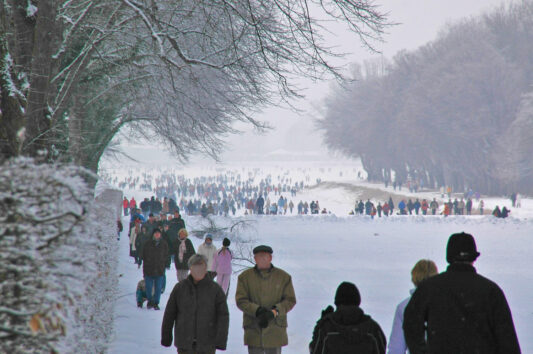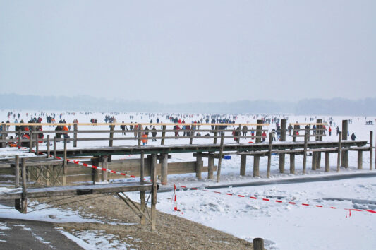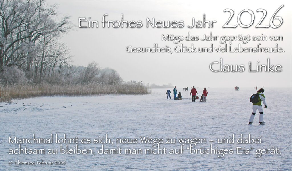 Zum Thema „Neue Wege gehen“ zeigt die Bilderserie den zugefrorenen Chiemsee im Februar 2006 – ein Bild aus nicht so langer Vergangenheit, das angesichts des Klimawandels zunehmend unwahrscheinlicher wird.