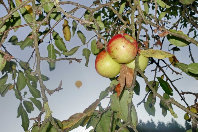 Wenn sich ein großer Heißluftballon unter die Äpfel mischt, dann kommt er ganz klein raus – dies zeigen diese Aufnahmen, die heuer möglich sind, weil die Apfelernte aussergewöhnlich stark ausfällt. Die Aufnahmen entstanden im Priener Ortsteil Prutdorf.