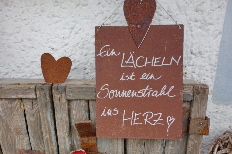 Oft ist es ganz einfach, seine innere Zufriedenheit zu finden – manchmal hilft ein Tipp am Wegesrand oder bei ideenreich und nett geschmückten Häusern – wie diese Aufnahme zeigt mit dem Spruch: “Ein Lächeln ist ein Sonnenstrahl ins Herz” – leider geht jedoch in Corona-Zeiten bei Maskenpflicht ein Teil des Lächelns und des Sonnenstrahls unter.