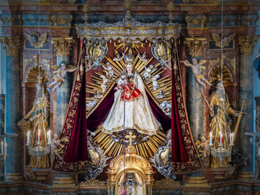 Gnadenbild der Muttergottes im Säulenaufbau des Hochaltars: Tuntenhausen ist einer der ältesten Marienwallfahrtsorte in Bayern. Zur Madonna in der Pfarr- und Wallfahrtskirche Mariä Himmelfahrt pilgern die Menschen seit Jahrhunderten. Die Marienskulptur wurde Mitte des 16. Jahrhunderts von einem unbekannten Bildhauer geschnitzt. Sie ist einem Gnadenbild nachempfunden, das bei einem Brand im Jahr 1548 zerstört wurde.