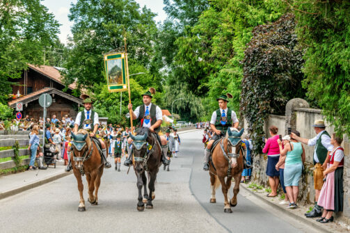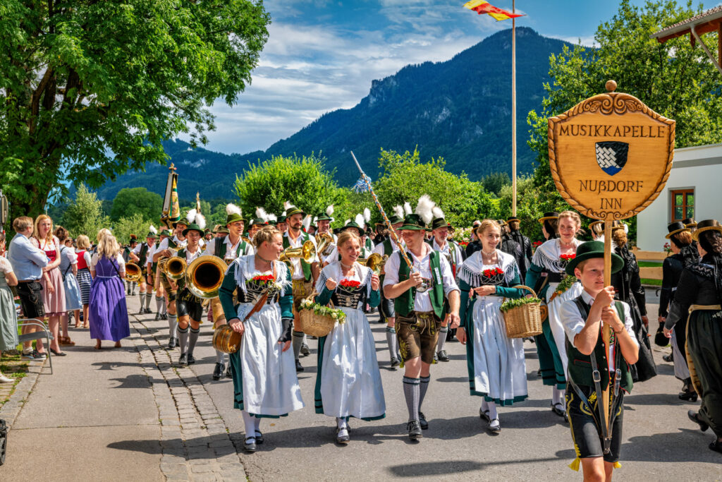 Dazwischen die Musikkapellen aus Nußdorf, Neubeuern, Oberaudorf, Rohrdorf, Flintsbach und vielen weiteren Gemeinden, die im Gleichschritt spielten und das Dorf mit bayerischen Märschen erfüllten.