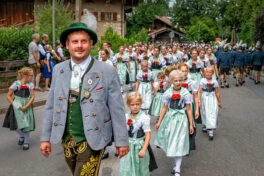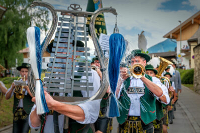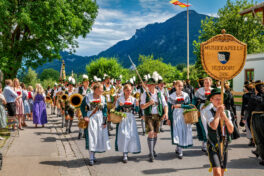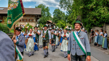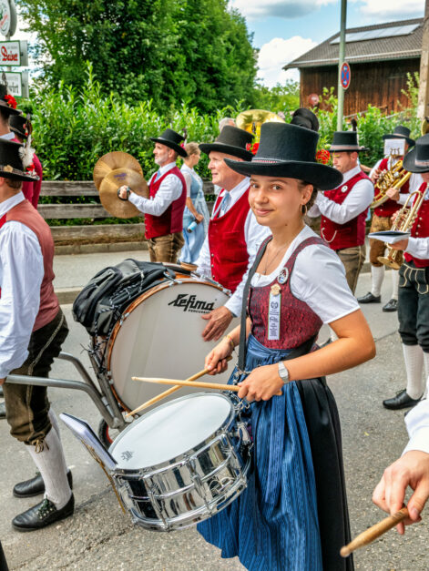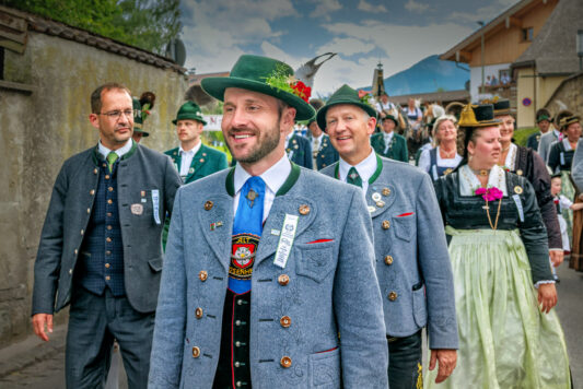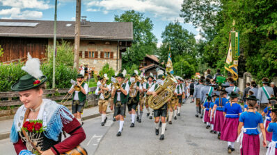 Die Sonne meinte es gut – fast schon zu gut – und so reihten sich Dirndln, Burschen, Musikanten und Ehrenmitglieder im Gleichschritt durch das Ortsbild. Vorneweg die Gastgeber vom GTEV D’Sulzbergler Brannenburg, würdevoll und mit sichtlichem Stolz auf die perfekte Organisation dieses Großereignisses.