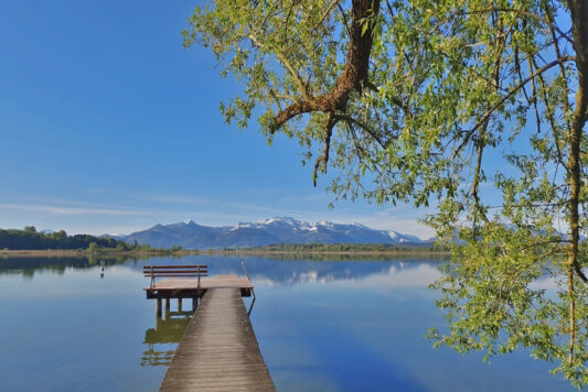Bei herrlichen Sonnenwetter und schneeverschneiten Bergen bietet sich ein wunderbares Panorama auf unser schönes Chiemgau.