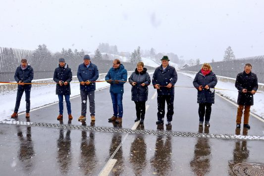 – Anlässlich der Verkehrsfreigabe für die Echelsbacher Brücke am Sonntag, 28. November 2021 waren folgende Personen aktiv dabei – von links nach rechts: Stefan Scheckinger, Behördenleiter des Staatlichen Bauamts Weilheim; Gerhard Pahl, Dr. Schütz Ingenieure; Gerald Greunz, Firma Strabag AG; Alexander Dobrindt (MdB), Vorsitzender der CSU-Landesgruppe im Bundestag; Andreas Jochner-Weiß, Landrätin des Landkreises Weilheim-Schongau; Anton Speer, Landrat des Landkreises Garmisch-Partenkirchen; Gisela Kieweg, Bürgermeisterin der Gemeinde Bad Bayersoien; Christoph Prause, Abteilungsleiter Konstruktiver Ingenieurbau am Staatlichen Bauamt Weilheim.