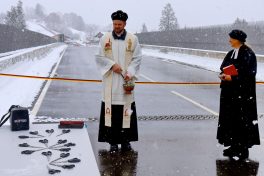 – Herr Pfarrer Josef Fegg aus Rottenbuch für die katholische Kirche und Frau Pfarrerin Bettina Mogk aus Peißenberg für die evangelische Kirche segnen die Echelsbacher Brücke vor der Verkehrsfreigabe am 28.11.2021.