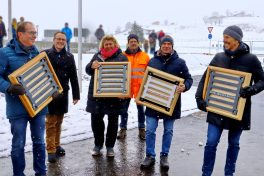 – Als Andenken erhalten im Rahmen der Verkehrsfreigabe der Echelsbacher Brücke am 28.11.2021 – von links nach rechts – Alexander Dobrindt (MdB), Vorsitzender der CSU-Landesgruppe im Bundestag; Christoph Prause, Abteilungsleiter Konstruktiver Ingenieurbau am Staatlichen Bauamt Weilheim; Gisela Kieweg, Bürgermeisterin der Gemeinde Bad Bayersoien; Wolfgang Rieger, Staatliches Bauamt Weilheim; Markus Balser, Strabag AG; Gerhard Pahl, Dr. Schütz Ingenieure, aufbereitete Brückeneinläufe der historischen Brücke.