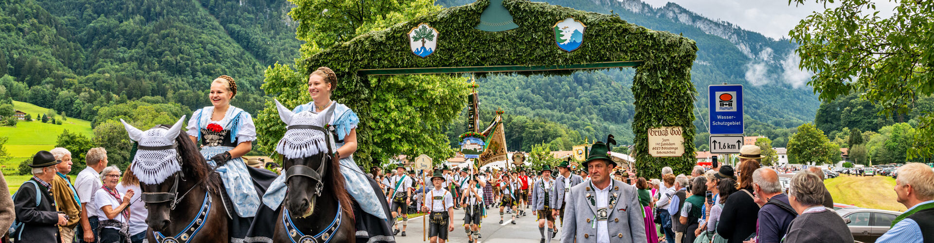 Aschau, Hohenaschau – Der Festsonntag des Chiemgau-Alpenverbandes für Tracht und Sitte in Hohenaschau war ein beeindruckendes und farbenprächtiges Ereignis. Der Tag begann frühmorgens mit einem musikalischen Weckruf der Musikkapelle, die den Festleiter, Vereinsvorstand, Bürgermeister und Schirmherrn Ludwig Freiherr von Cramer-Klett musikalisch aufweckte.