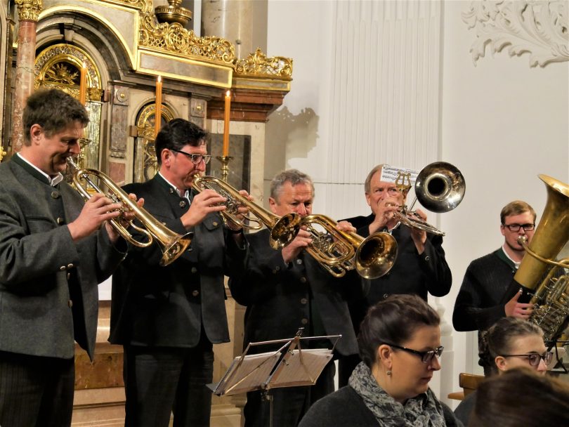 Abwechselnd untermalten die Hohenaschauer Bläser, das Kirchleitn Ensemble und der Familiengsang Abstreiter, der von Katharina Wiesholler auf der Harfe begleitet wurden die einzelnen Stationen der Lebens- und Leidensgeschichte unseren Herrn.
